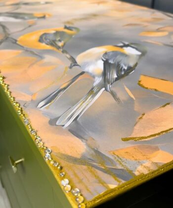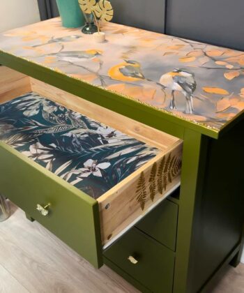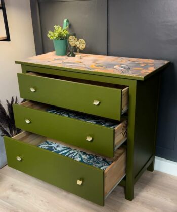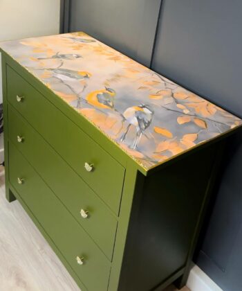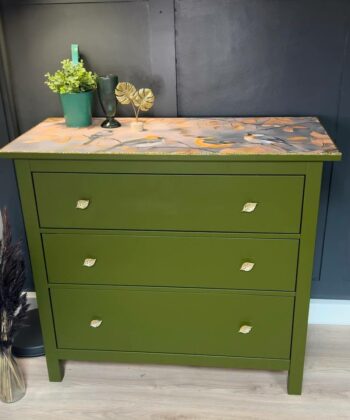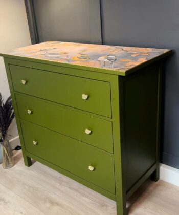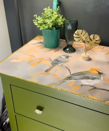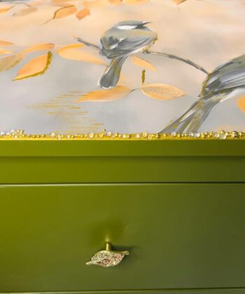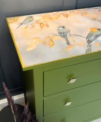 Introducing the Autumn Elegance Chest, a one-of-a-kind masterpiece designed to bring charm and sophistication to your space. This three-drawer chest has been meticulously renewed and painted in a luxurious olive green, blending modern minimalism with artistic flair. The top surface is adorned with an exquisite decoupage design featuring lifelike birds perched among golden leaves, creating a serene and nature-inspired ambiance.
