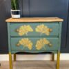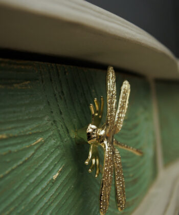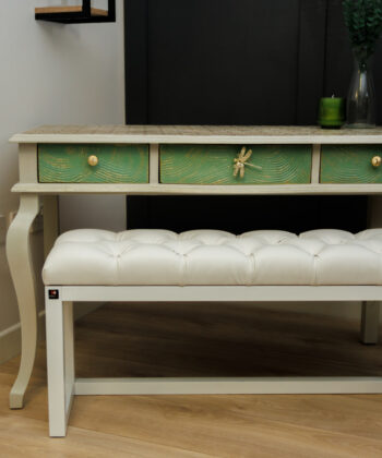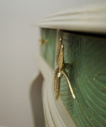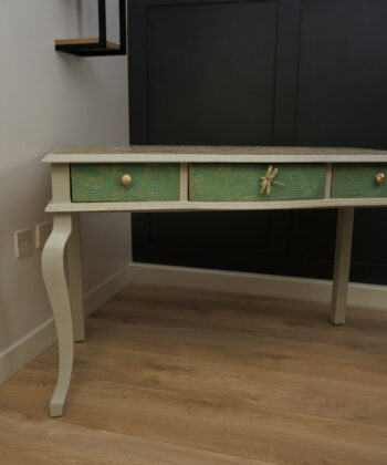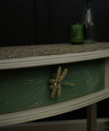 The Dragonfly Vintage Console is a stunning piece of restored furniture that brings character and elegance to any space. Measuring 120x59x75 cm, this table offers ample space with two drawers, each adorned with intricate dragonfly and floral hardware. The soft, sage green drawer fronts add a calming, earthy feel, perfectly complemented by the delicate gold accents. Ideal as an entryway console, vanity, or accent table, this unique piece embodies both vintage allure and timeless craftsmanship. Its curved legs add an extra touch of sophistication, making it a perfect addition to any classic or eclectic decor.