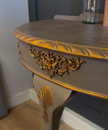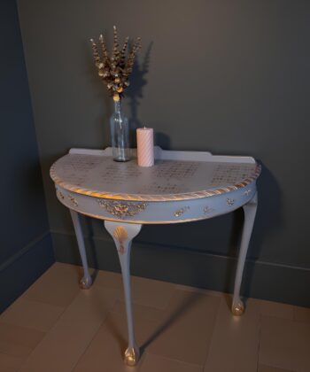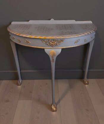 Elevate your hallway, living room, or entryway with this exquisite half-moon console table. Finished in a sophisticated shade of grey and adorned with hand-applied gold accents, this table blends classic elegance with modern charm. The intricate detailing on the apron and legs, including ornate motifs and shell embellishments, adds a touch of luxury to any interior. Its sturdy three-legged design ensures stability, while the compact, semi-circular shape makes it ideal for smaller spaces or as a statement piece in any room.