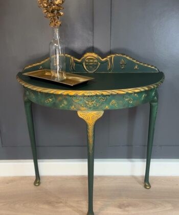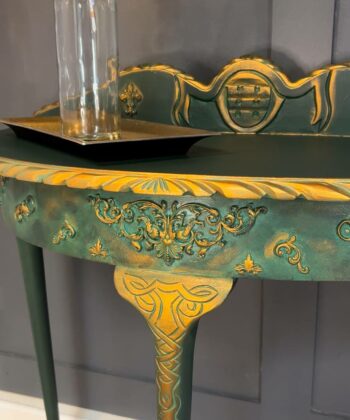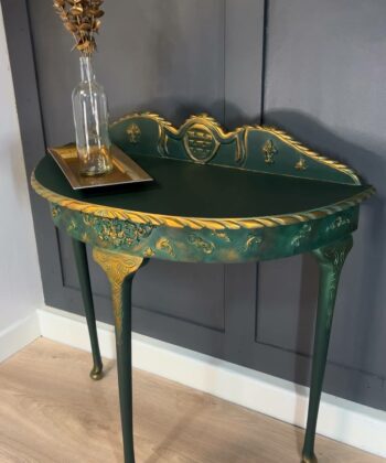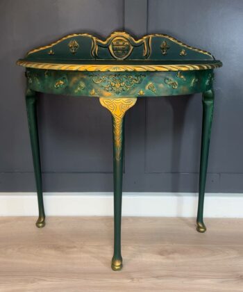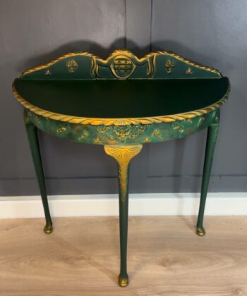 This stunning half-moon console table represents the perfect marriage of classic design and contemporary sophistication. The rich emerald green finish is enhanced with intricate gold leaf detailing, creating a luxurious statement piece for any interior.
