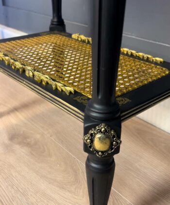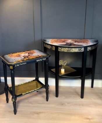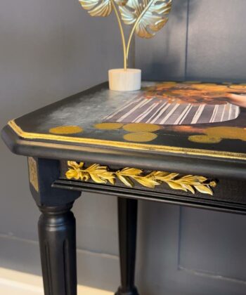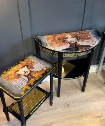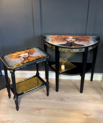 The gilded muse side table is a true work of art, blending classic craftsmanship with bold contemporary expression. This striking accent table features a meticulously hand-painted black frame, highlighted by gold leaf detailing along the edges and sculpted legs. The focal point is a dramatic decoupage of a woman’s face, framed by flowing golden accents, giving the table a unique and luxurious presence.