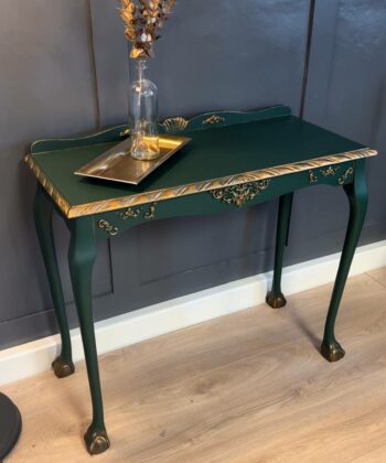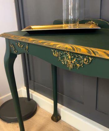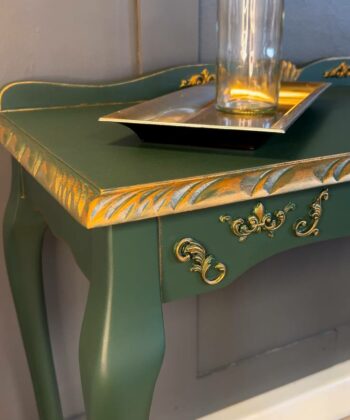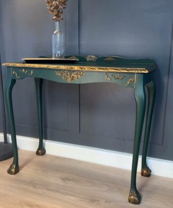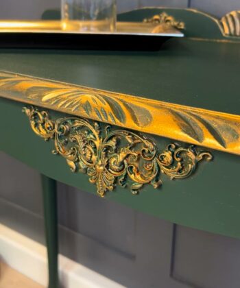 This beautifully restored half-moon table has been transformed into a statement piece of furniture. Hand-painted in a rich deep green and highlighted with intricate gold details, it exudes timeless elegance. The table features delicate carvings on the edges and legs, enhanced by the luxurious golden accents, creating a stunning contrast. Its compact yet stylish design makes it a versatile piece, ideal for hallways, living rooms, or bedrooms. Finished with a satin protective coat, it ensures durability while maintaining its sophisticated charm.