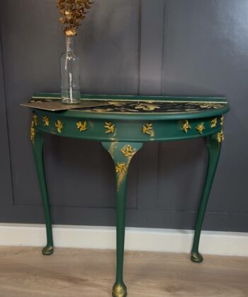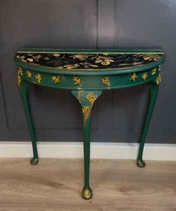 If you’re searching for a statement piece, the golden leaves console table is the perfect choice for your home. This elegant console table features a semi-circular top with hand-painted golden leaf motifs on a durable, canvas-like surface. The rich green lacquer finish, highlighted by gold details on the legs and edges, adds a luxurious touch to any interior. The golden leaves console table is ideal for hallways, living rooms, or corridors, instantly elevating your décor with its artistic design.