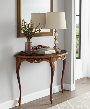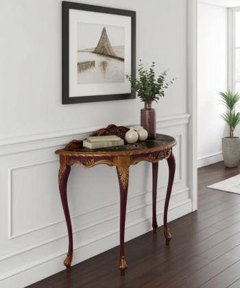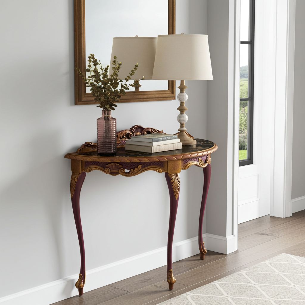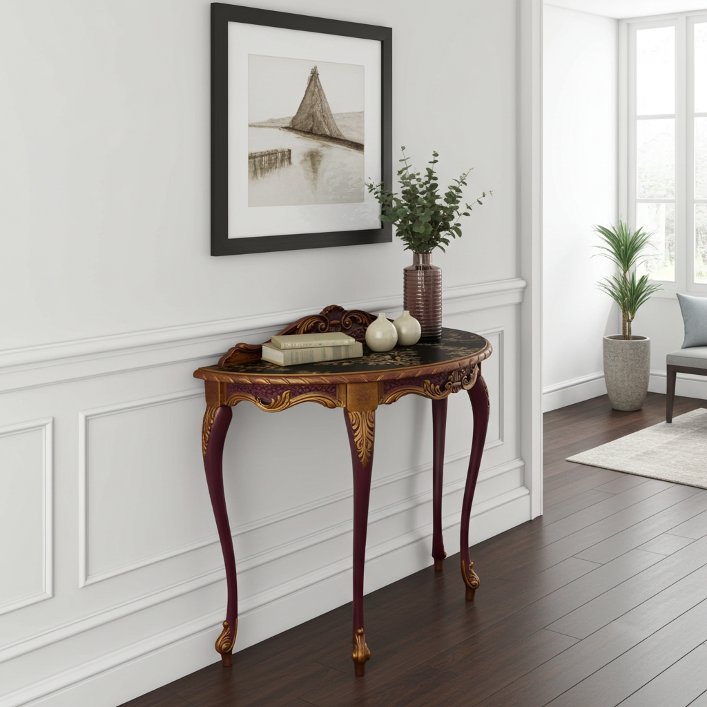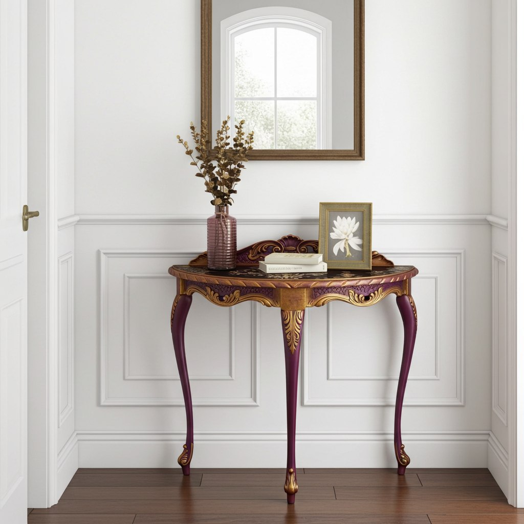 Because every highlight on the carved apron, legs, and edge is applied by hand, no two consoles are exactly the same. This makes the Imperial Plum & Gold Demi-Lune perfect for customers searching for a one-of-a-kind, sustainable furniture piece with real character. Style it with a vase, lamp, or candle arrangement to create a luxurious focal point in your home.