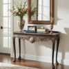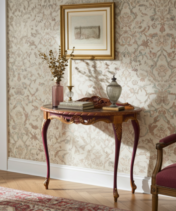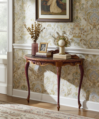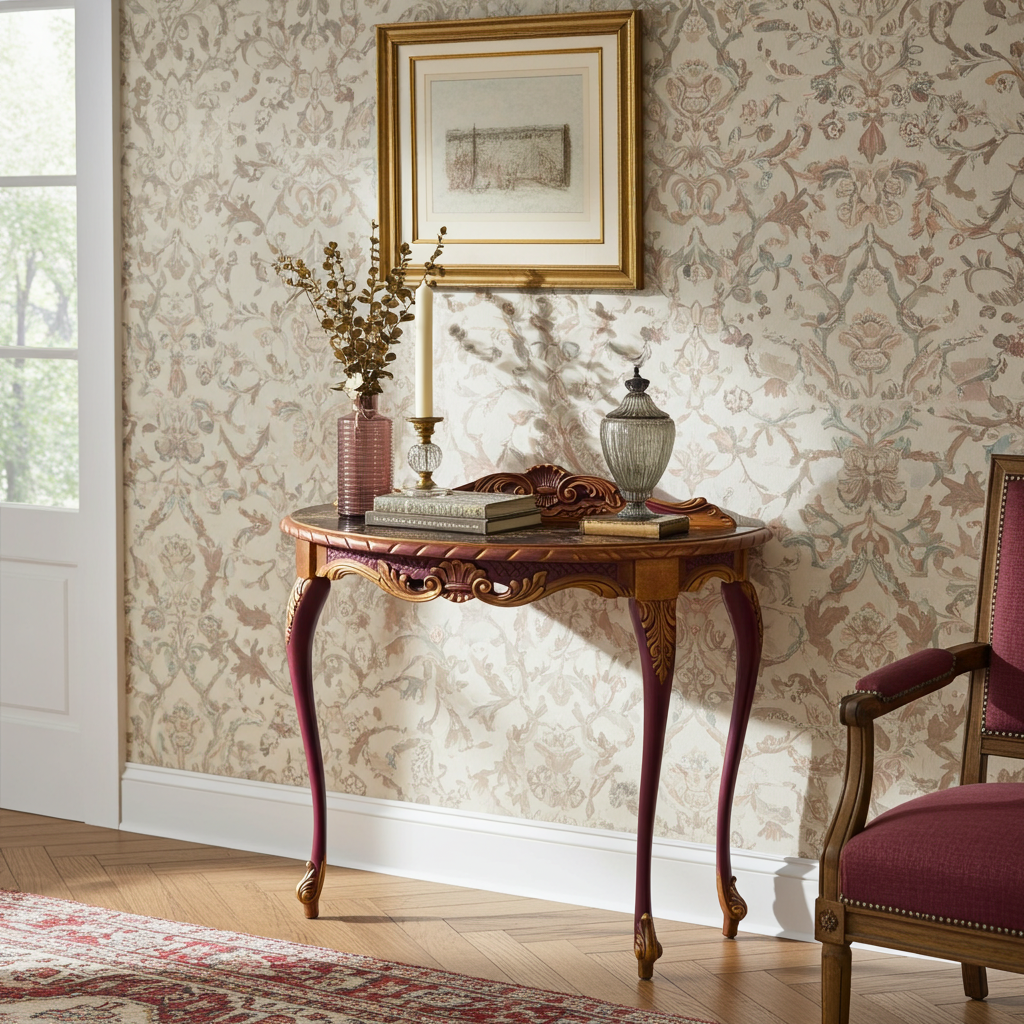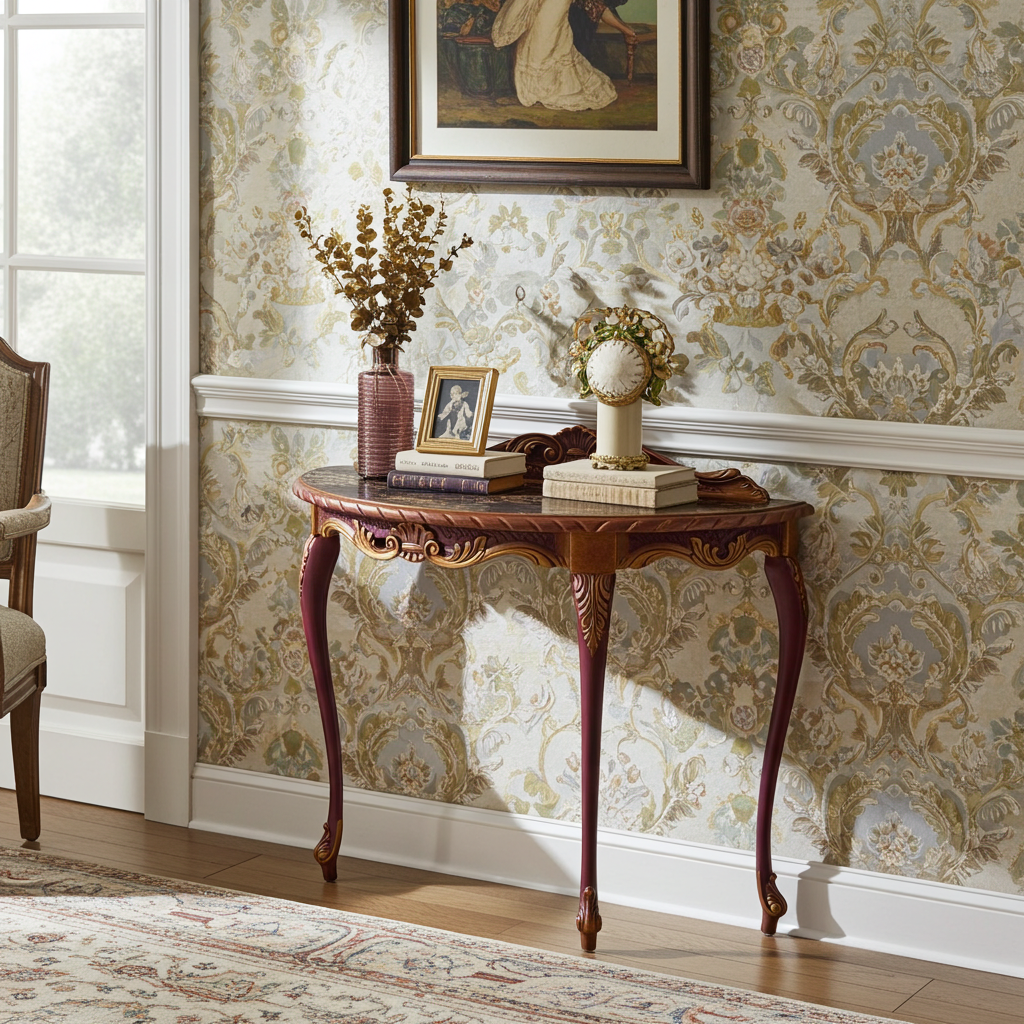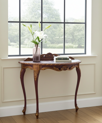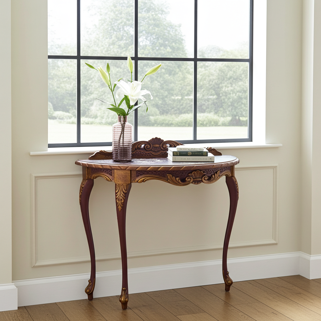 Because every highlight on the carved apron, legs, and edge is applied by hand, no two consoles are exactly the same. This makes the Imperial Plum & Gold Demi-Lune perfect for customers searching for a one-of-a-kind, sustainable furniture piece with real character. Style it with a vase, lamp, or candle arrangement to create a luxurious focal point in your home.