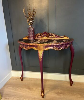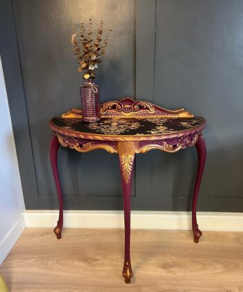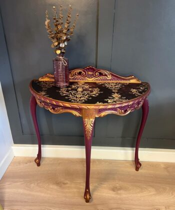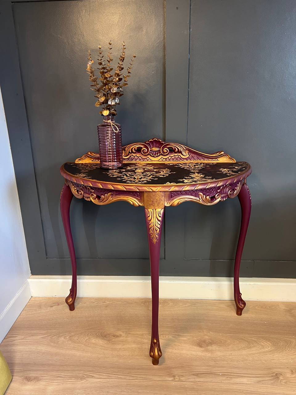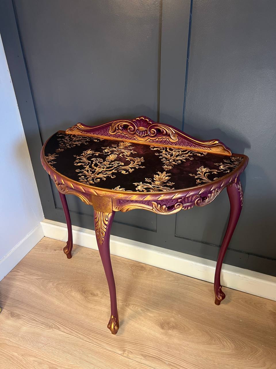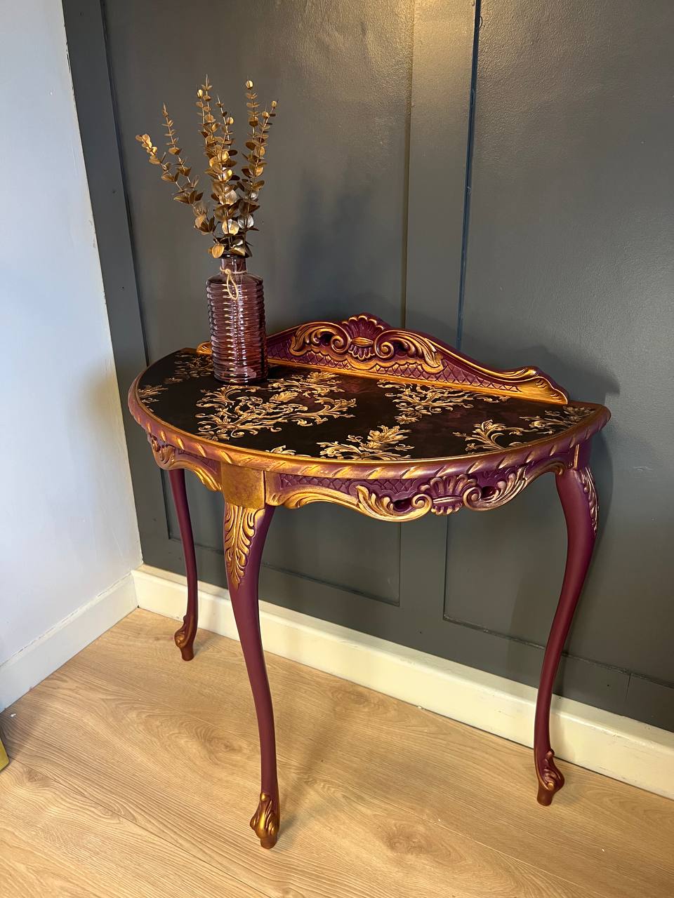 – Dimensions: 90 cm (width) x 40 cm (depth) x 76 cm (height) – Fully restored piece in very good condition – Entire console sandblasted before refinishing – Hand-painted in rich plum and gold tones – Hand-applied gilding on carvings and details – Fully lacquered for durability and easy care – Top covered with extremely strong canva-style material – Elegant demi-lune (half-moon) shape for hallways and feature walls – Ideal as an entryway table, dressing-room accent or living room console