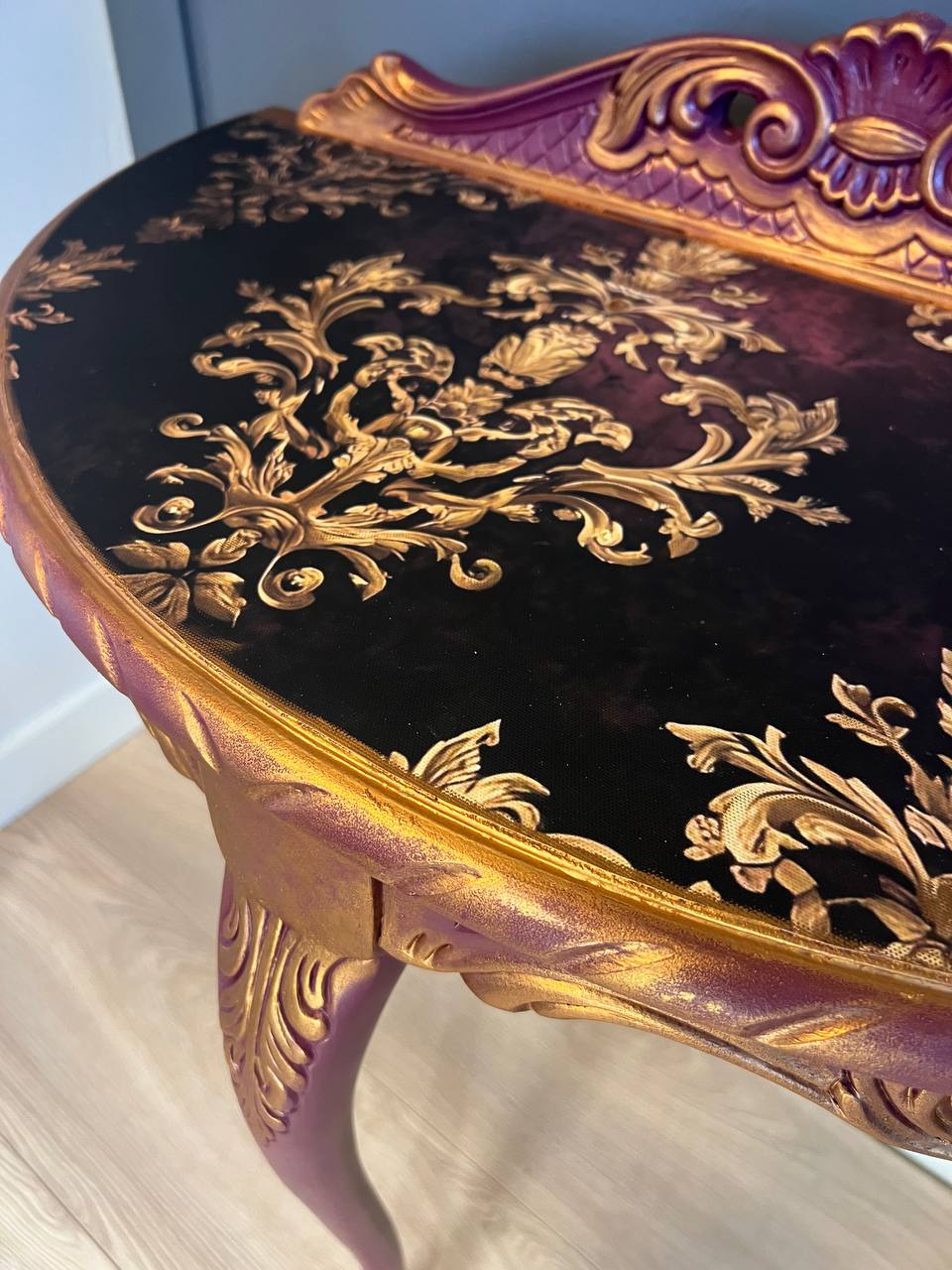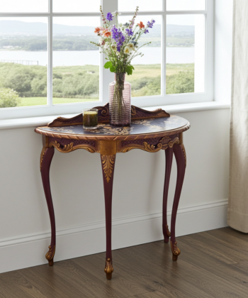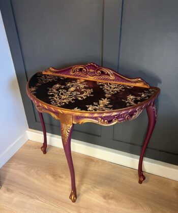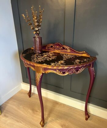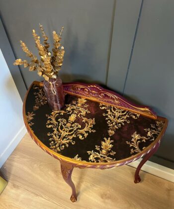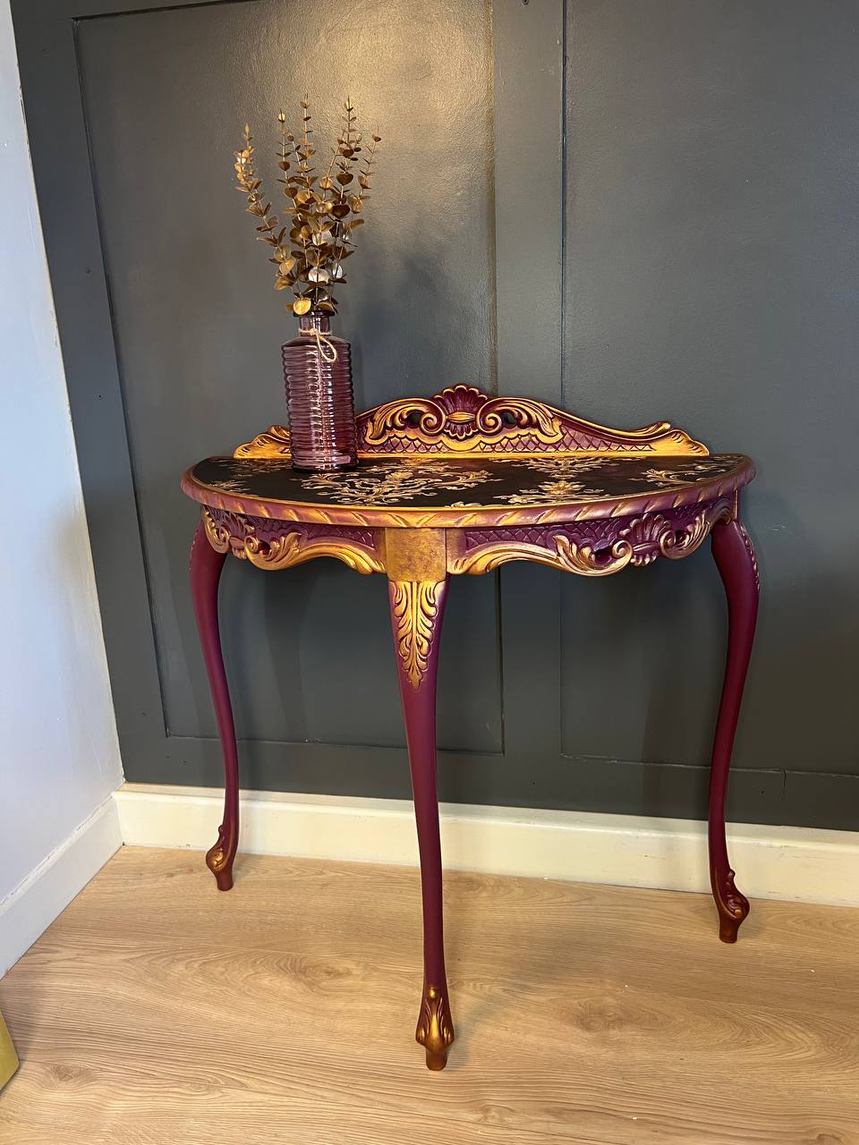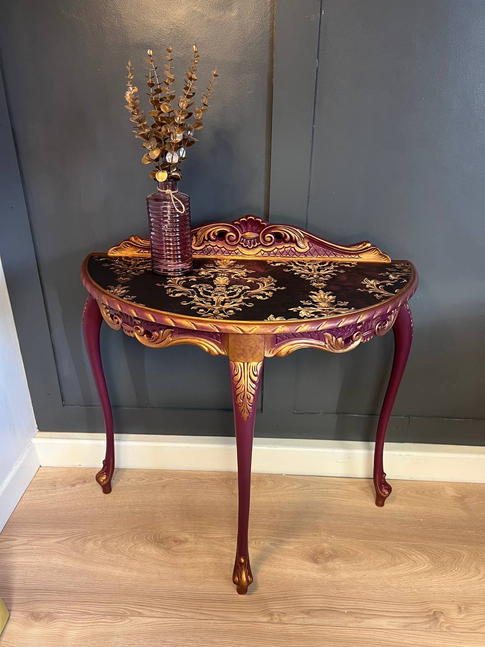 – Dimensions: 90 cm (width) x 40 cm (depth) x 76 cm (height) – Fully restored piece in very good condition – Entire console sandblasted before refinishing – Hand-painted in rich plum and gold tones – Hand-applied gilding on carvings and details – Fully lacquered for durability and easy care – Top covered with extremely strong canva-style material – Elegant demi-lune (half-moon) shape for hallways and feature walls – Ideal as an entryway table, dressing-room accent or living room console