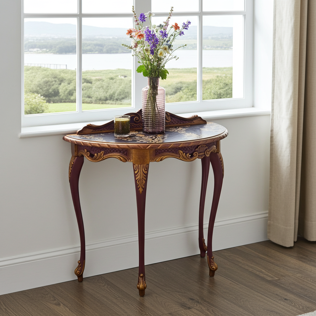 Imperial Plum & Gold Demi-Lune Console Table – Hand-Painted, Gilded and Fully Restored Statement Piece with Durable Canva Top