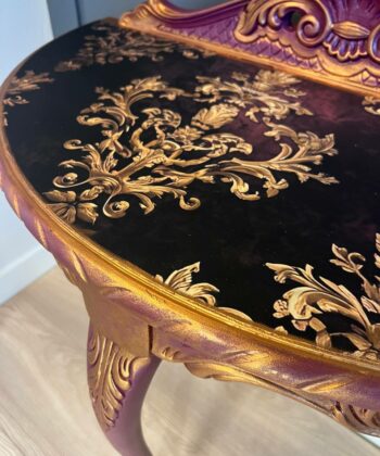 The Imperial Plum & Gold Demi-Lune Console Table is a fully restored statement piece that brings drama and luxury to any hallway, living room, or bedroom. Measuring 90 x 40 x 76 cm, this elegant half-moon console offers a slim profile that sits neatly against the wall while still providing a generously sized decorative surface. Rich plum tones, deep black background and ornate golden flourishes create a unique, baroque-inspired look that instantly draws the eye.