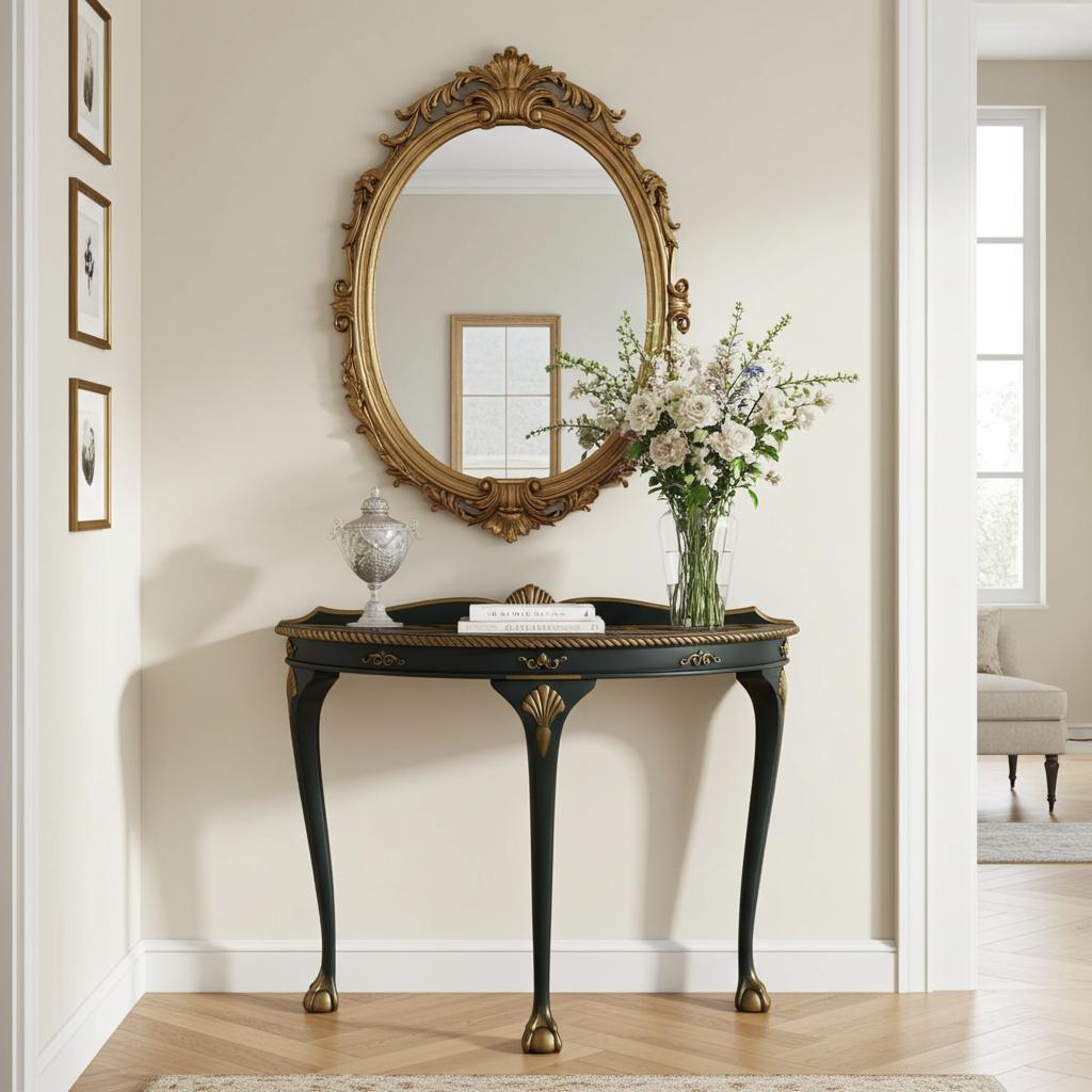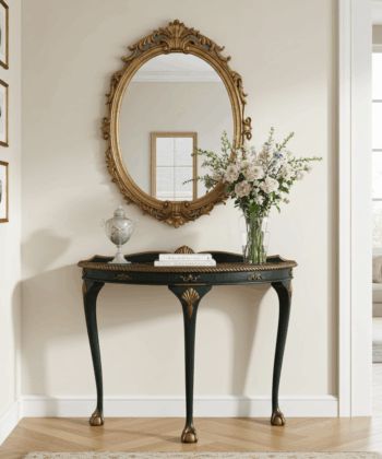 This console table stands out with its beautifully sculpted legs, each ending in a gold-painted claw foot. Shell motifs and polished lacquer add extra refinement and a smooth, glossy surface that catches the light. The Golden Elegance Half-Moon Table is more than just furniture—it’s a statement piece that brings sophistication and character to any space. With dimensions of 87 cm wide, 42 cm deep, and 76 cm high, it fits seamlessly into both large and small interiors25.