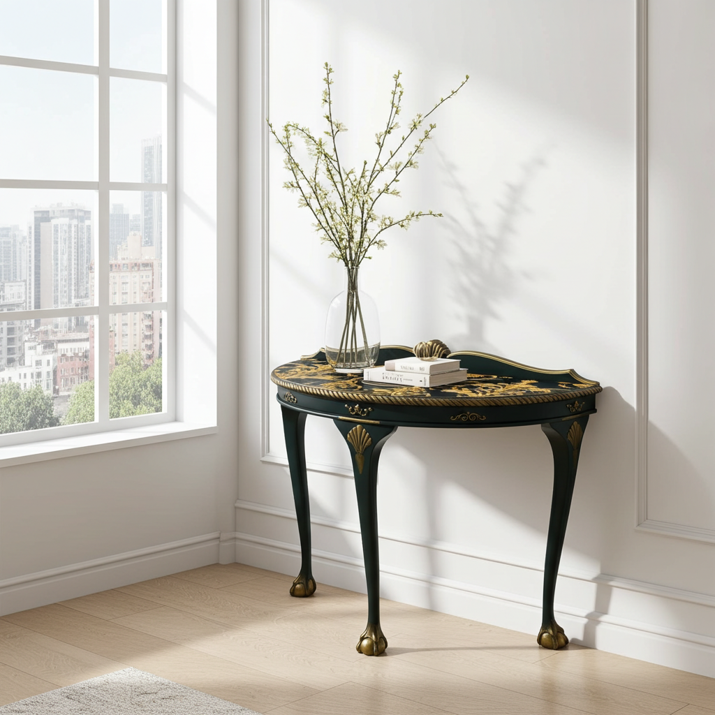 Golden Elegance Half-Moon Table – Deep Green Console with Gold Baroque Details