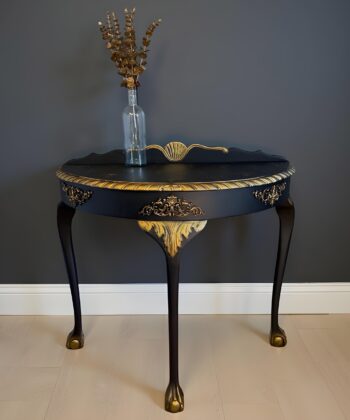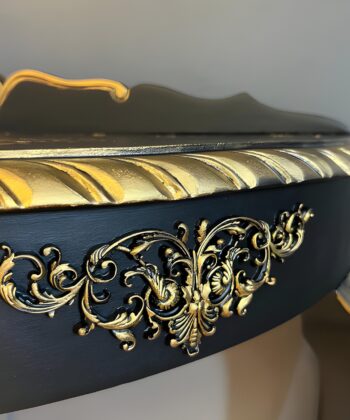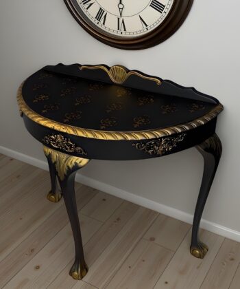Make a striking first impression with this luxury half-moon console table, impeccably finished in matte black and highlighted by intricate gold accents. Its semicircular design pairs classic hand-carved motifs with modern sophistication, delivering a bold style statement for hallways, entryways, or living rooms across Ireland. Delicate scrollwork, a raised central crest, and cabriole legs with claw feet echo antique French and Art Deco influences, while the smooth black top and ornate gold edging add visual drama.