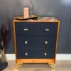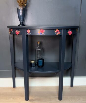 The Midnight Garden Console Table is a striking blend of functionality and art, designed to transform any room into a haven of creativity. With a hand-painted top, this console features beautiful floral patterns in warm tones of pinks and golds, contrasted by playful bird silhouettes, evoking a tranquil scene from a midnight garden. The sturdy, deep blue frame complements the colorful artwork, offering not only aesthetic appeal but also practical storage with a lower shelf for decor or essentials.