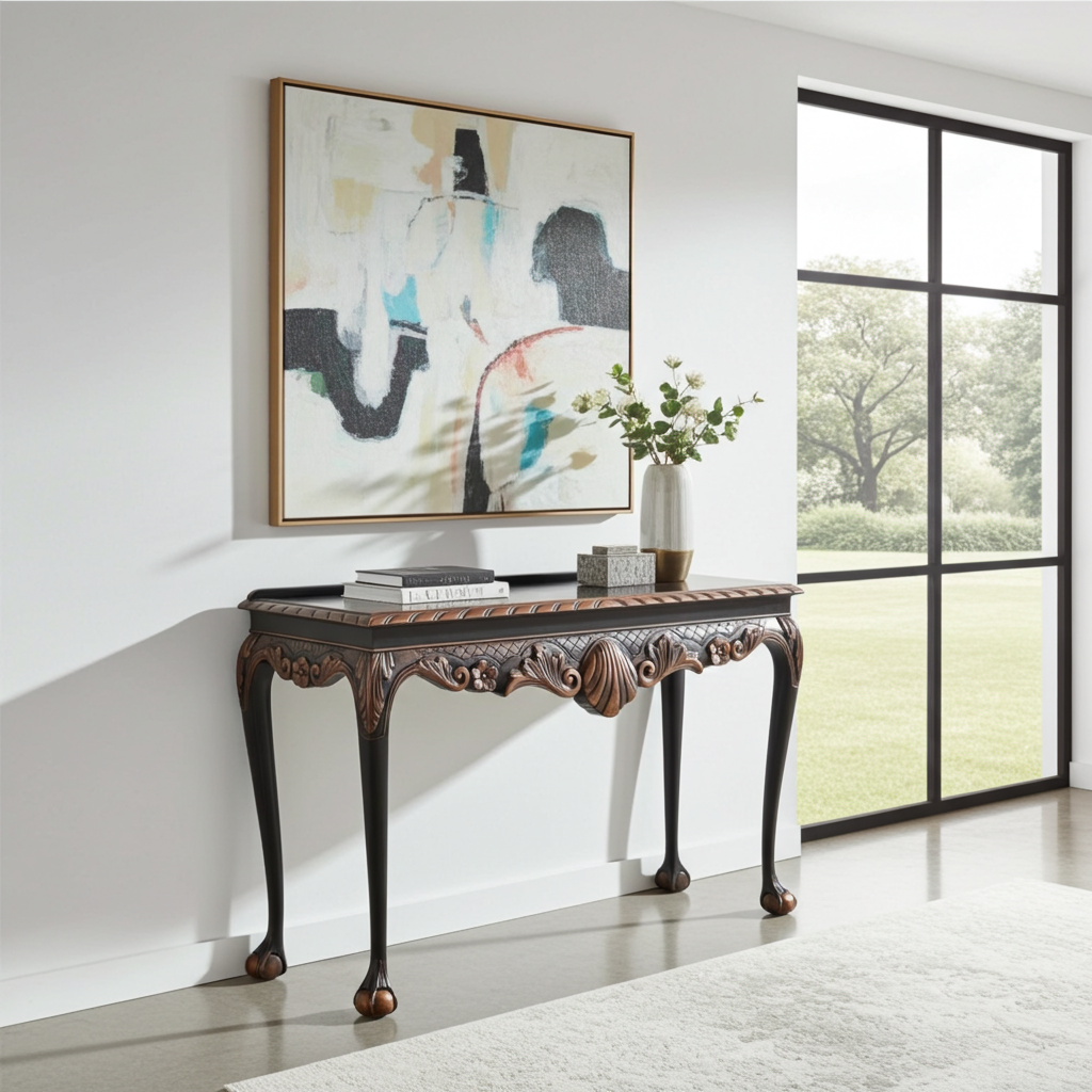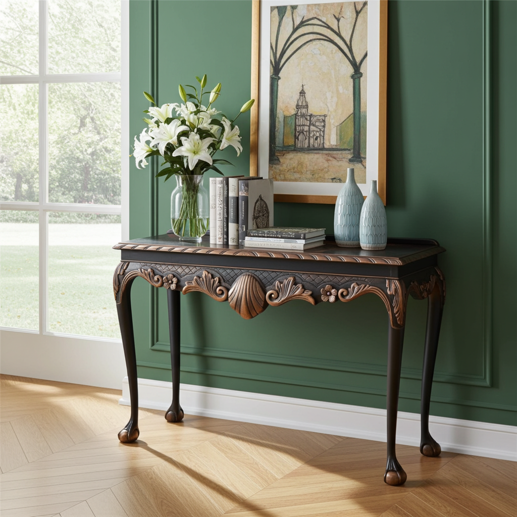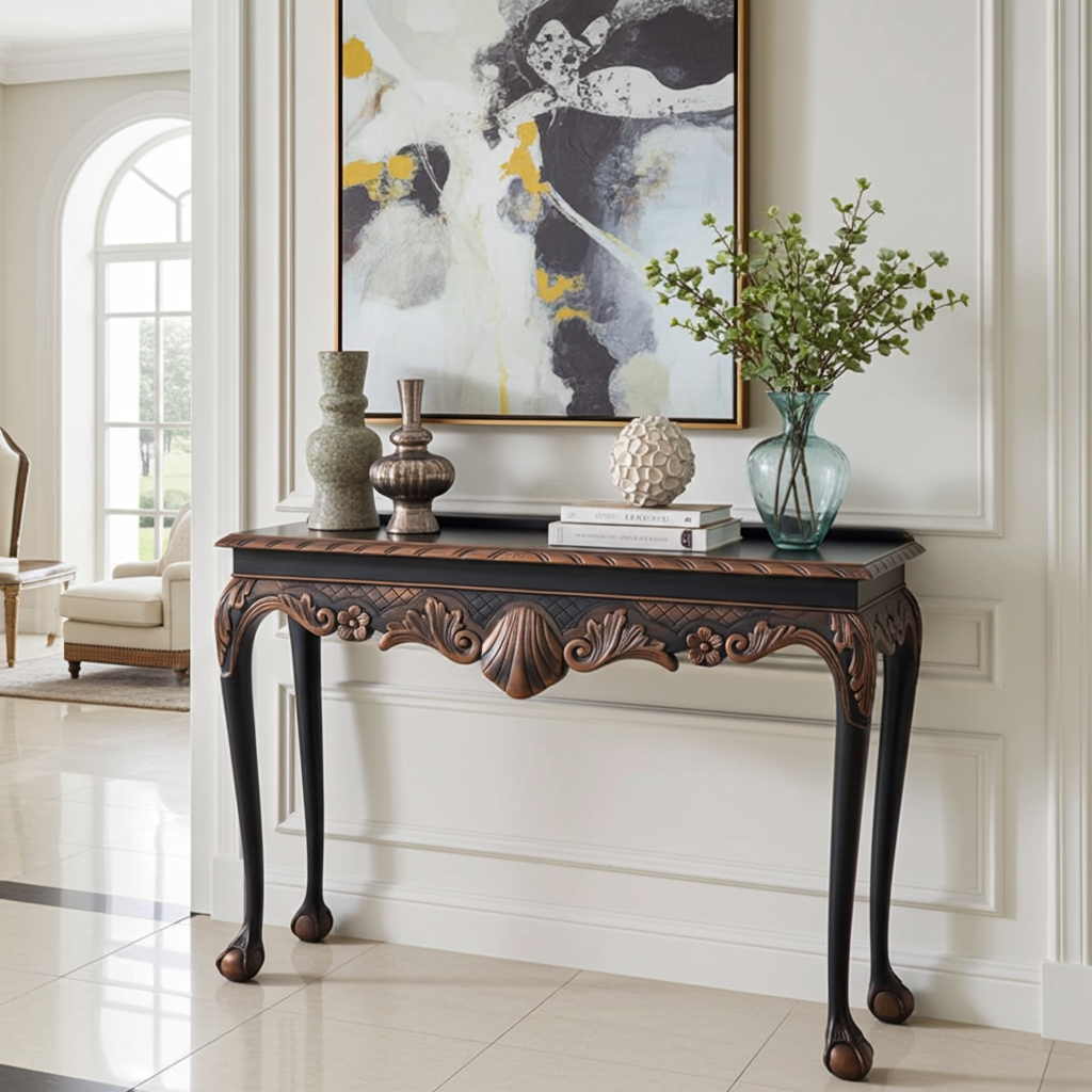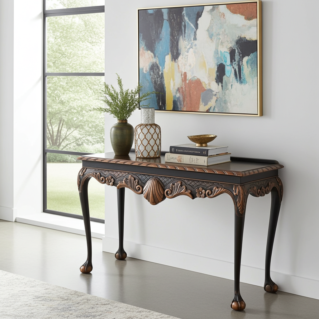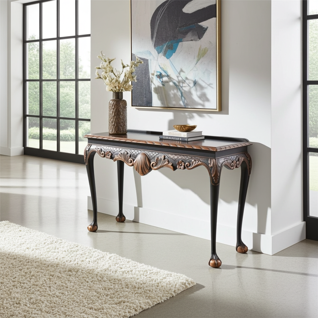 Hand-applied copper detailing accentuates every carving along the apron and ball feet, so the console looks impressive from any angle. Because of its narrow depth, the piece fits perfectly in hallways or behind sofas, while still providing space for lamps, candles, or decor. This is a unique, restored furniture piece, ideal for customers who value craftsmanship, character, and sustainable interior design.