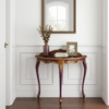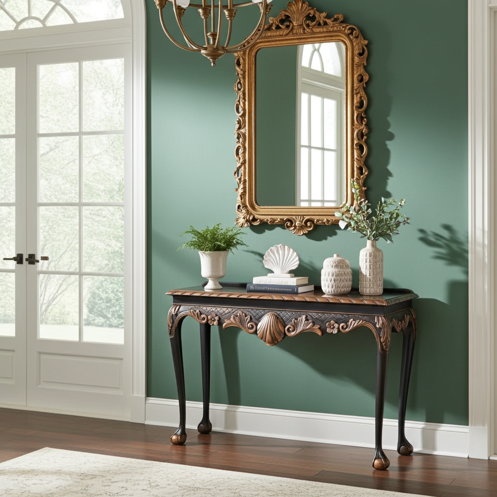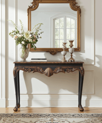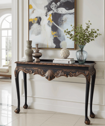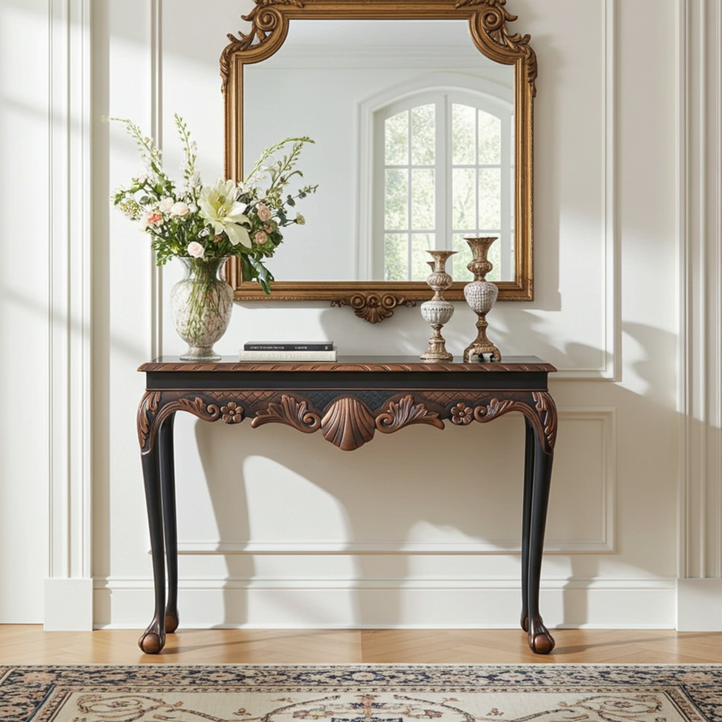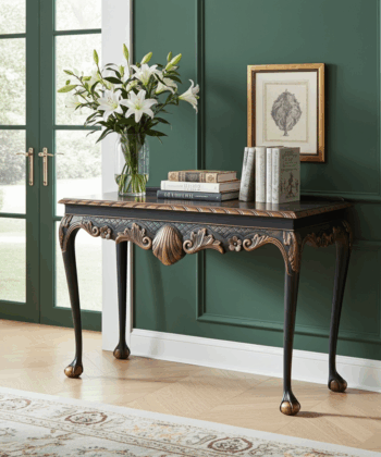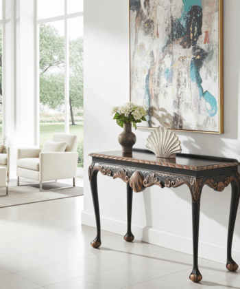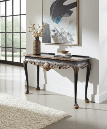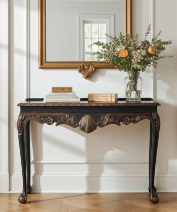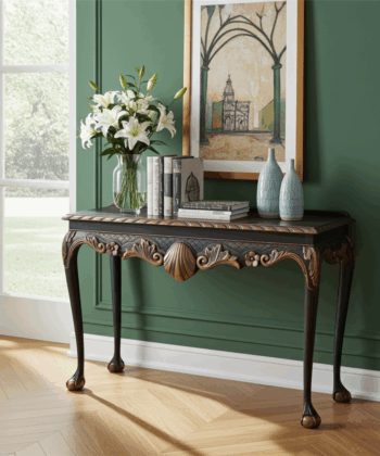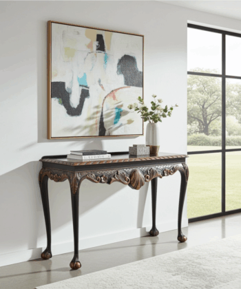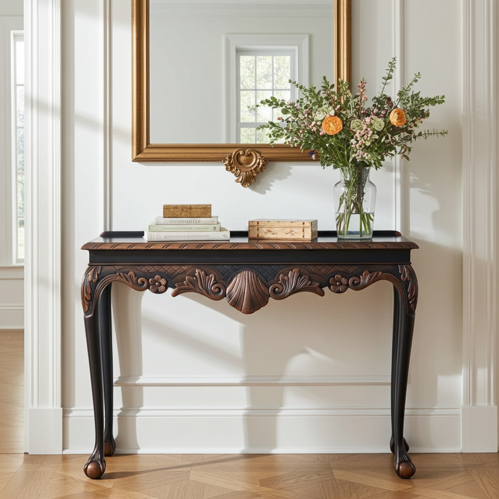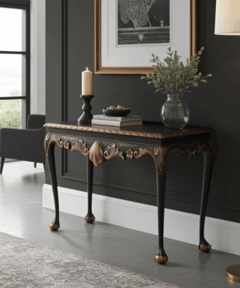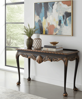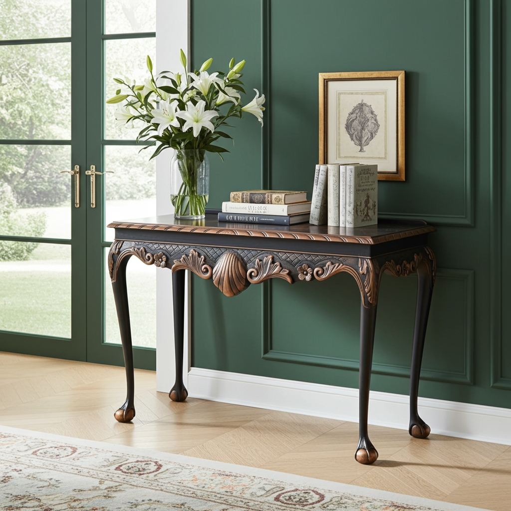 Hand-applied copper detailing accentuates every carving along the apron and ball feet, so the console looks impressive from any angle. Because of its narrow depth, the piece fits perfectly in hallways or behind sofas, while still providing space for lamps, candles, or decor. This is a unique, restored furniture piece, ideal for customers who value craftsmanship, character, and sustainable interior design.