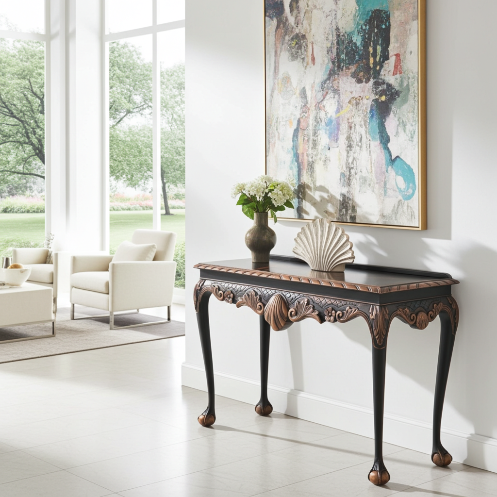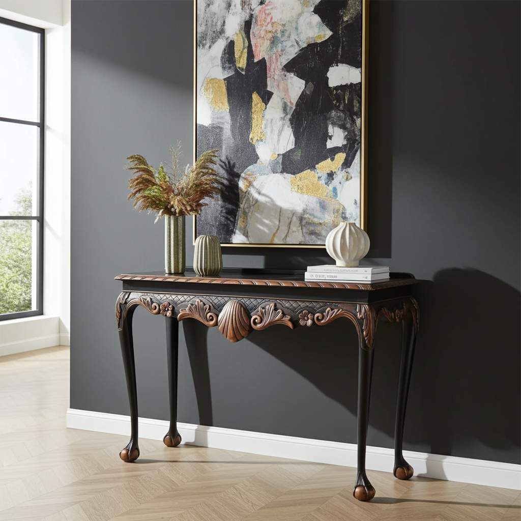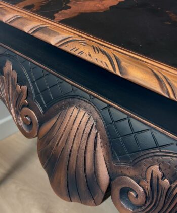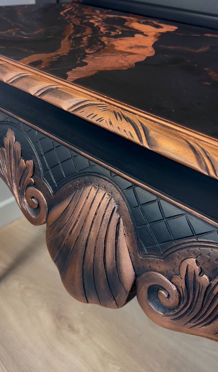 This one-of-a-kind Regal Copper Shell Console Table turns any hallway, living room, or bedroom into a boutique interior. Fully restored from top to bottom, the piece now measures 106 x 45 x 77 cm and offers the presence of a luxury designer console with a unique hand-finished look. The rich black base contrasts beautifully with warm copper highlights, while the carved shell and floral details create an elegant, vintage-inspired silhouette.
