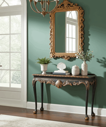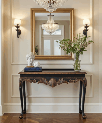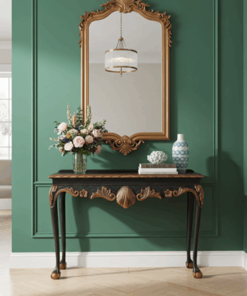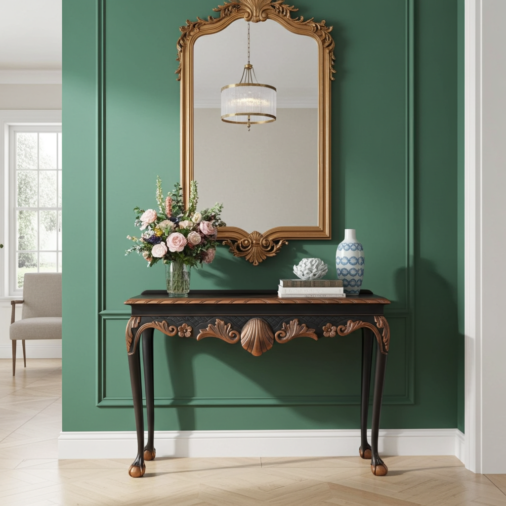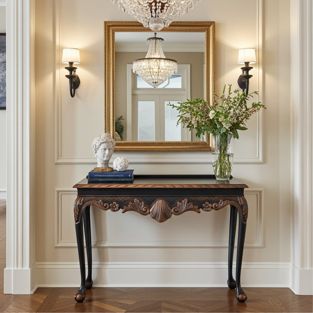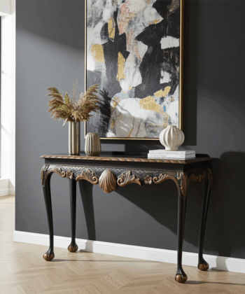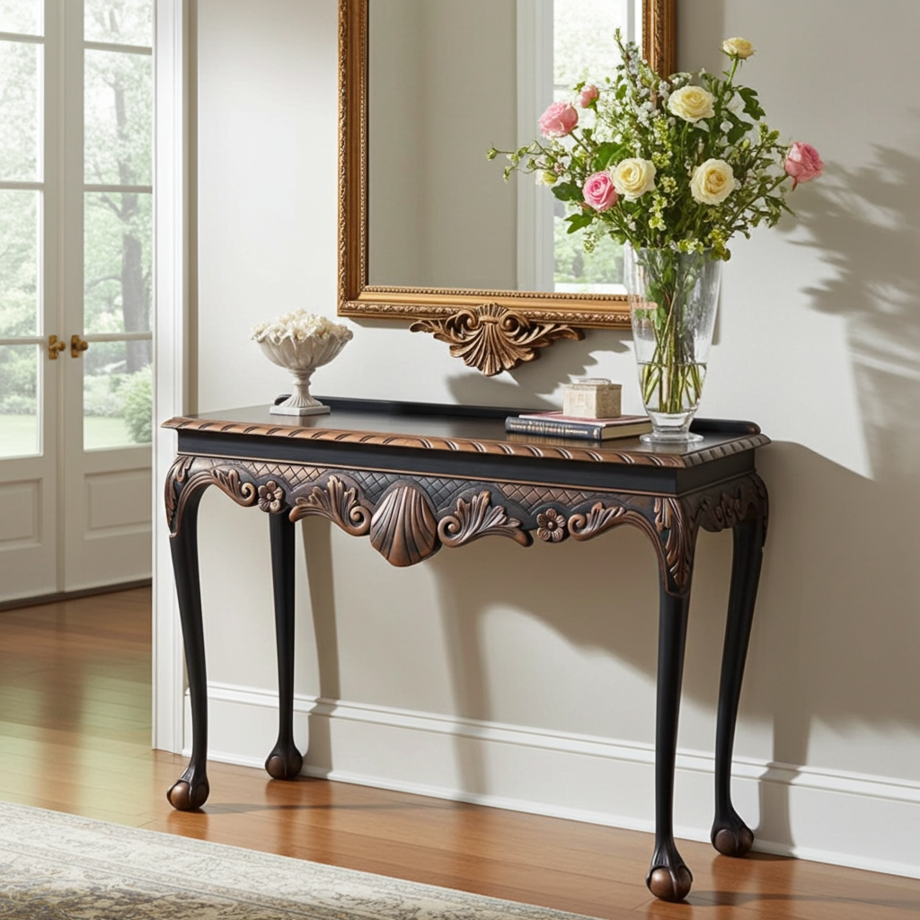 This one-of-a-kind Regal Copper Shell Console Table turns any hallway, living room, or bedroom into a boutique interior. Fully restored from top to bottom, the piece now measures 106 x 45 x 77 cm and offers the presence of a luxury designer console with a unique hand-finished look. The rich black base contrasts beautifully with warm copper highlights, while the carved shell and floral details create an elegant, vintage-inspired silhouette.