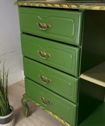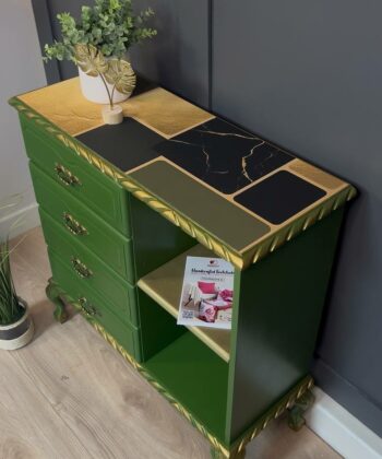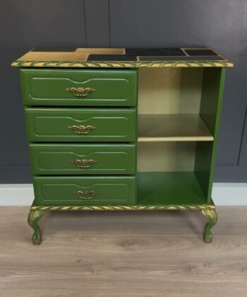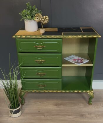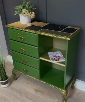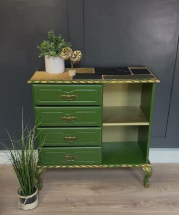 Introducing the Emerald Elegance, a handcrafted masterpiece that effortlessly combines vintage charm with modern design. This versatile piece of furniture is perfect for adding a touch of sophistication to any room in your home. Whether used as a dresser, console table, or sideboard, the Emerald Elegance will transform your space into a stylish haven.