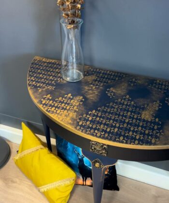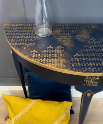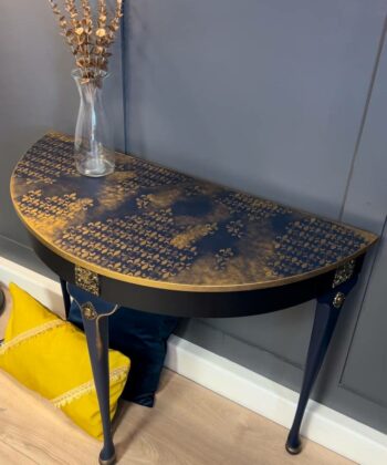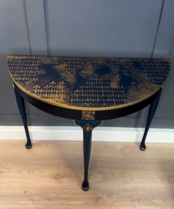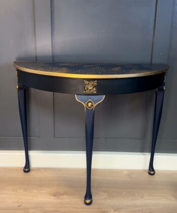 The Royale Console is a stunning, hand-restored half-moon table with luxurious navy and gold detailing. With its elegant floral patterns and regal accents, this piece is perfect for adding timeless sophistication to your home decor. Dimensions: 97 cm (W) x 45 cm (D) x 75 cm (H).