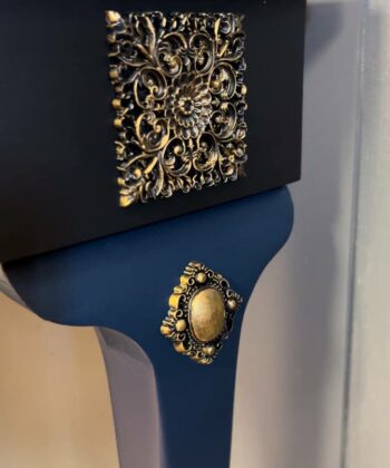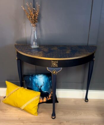 Introducing The Royale Console, a striking fusion of traditional elegance and modern artistry. This half-moon console table has been lovingly restored with a deep navy finish and adorned with intricate gold floral patterns. The table’s legs, delicately curved and accented with golden touches, exude a sense of grace. Perfect as a statement piece for a hallway, living room, or entryway, this unique table adds a touch of luxury to any space. At 97 cm wide, 45 cm deep, and 75 cm high, The Royale Console offers both style and function, making it a timeless addition to your home.