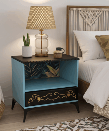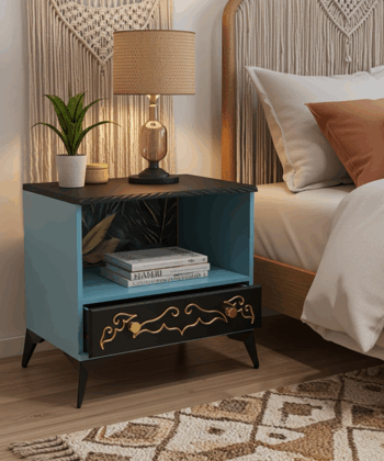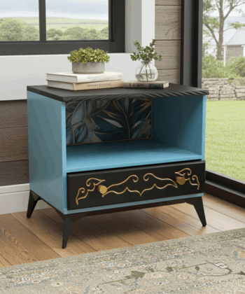 Infuse your bedroom with boutique-hotel flair. The Tropical Deco Nightstand pairs a matte‐black top and hand-carved geometric edging with a bold turquoise body for instant visual drama. A drawer front finished in hand-painted gold Art Deco scrollwork and luxe brass hardware adds gleam, while the drawer interior reveals custom tropical-leaf wallpaper for a surprise pop of colour. Compact yet eye-catching, this piece slips easily beside modern platform beds or vintage frames, bringing functional storage and sculptural style to Irish homes 1.