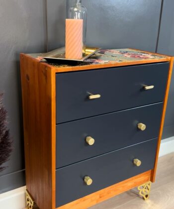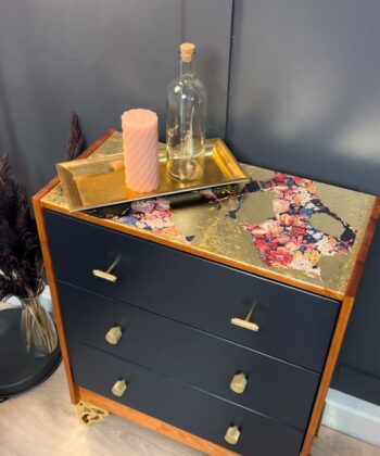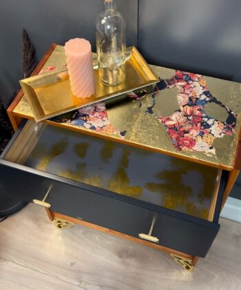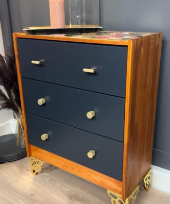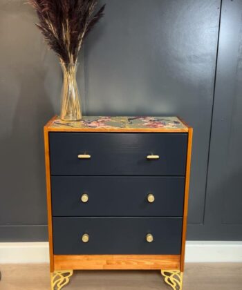 Add a unique blend of vintage charm and modern design to your space with this beautifully restored chest of drawers. Measuring 62x30x82 cm, this piece features a striking combination of rich wood tones and sleek matte black drawer fronts. The brass-finished handles and ornate metal legs lend a touch of glamour, while the floral decoupage design on the top adds a hint of artistry. Perfect for bedrooms, hallways, or living spaces, this chest offers both style and practicality with three spacious drawers to keep your essentials organized in elegance.