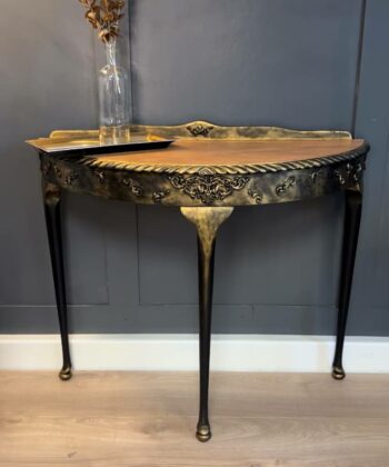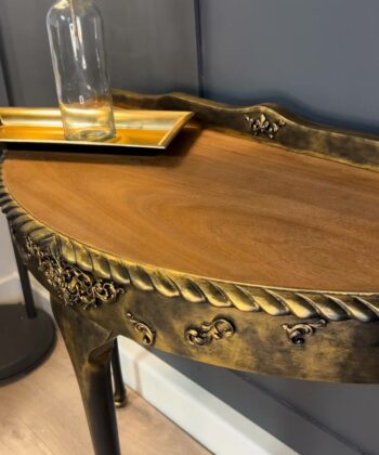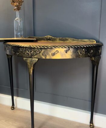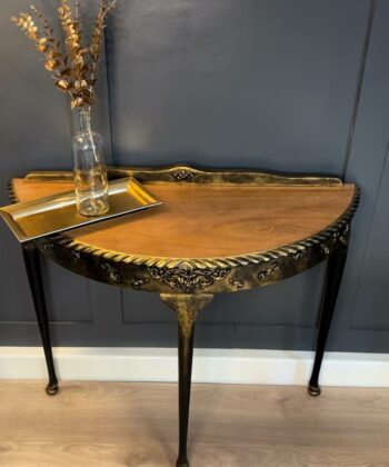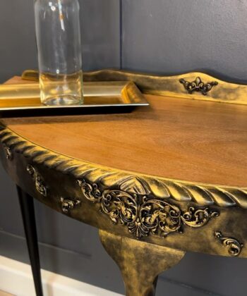The Vintage Elegance Half-Moon Console Table is a statement piece designed to bring sophistication and character to any interior. Its stunning half-moon shape is adorned with intricate, hand-finished gold detailing, complemented by a smooth wooden top. This console table is supported by gracefully curved black legs with a subtle gold accent, blending traditional design with modern finesse. Whether styled with decorative accessories, a vase, or a chic tray, this piece effortlessly elevates your living room, hallway, or entryway.
