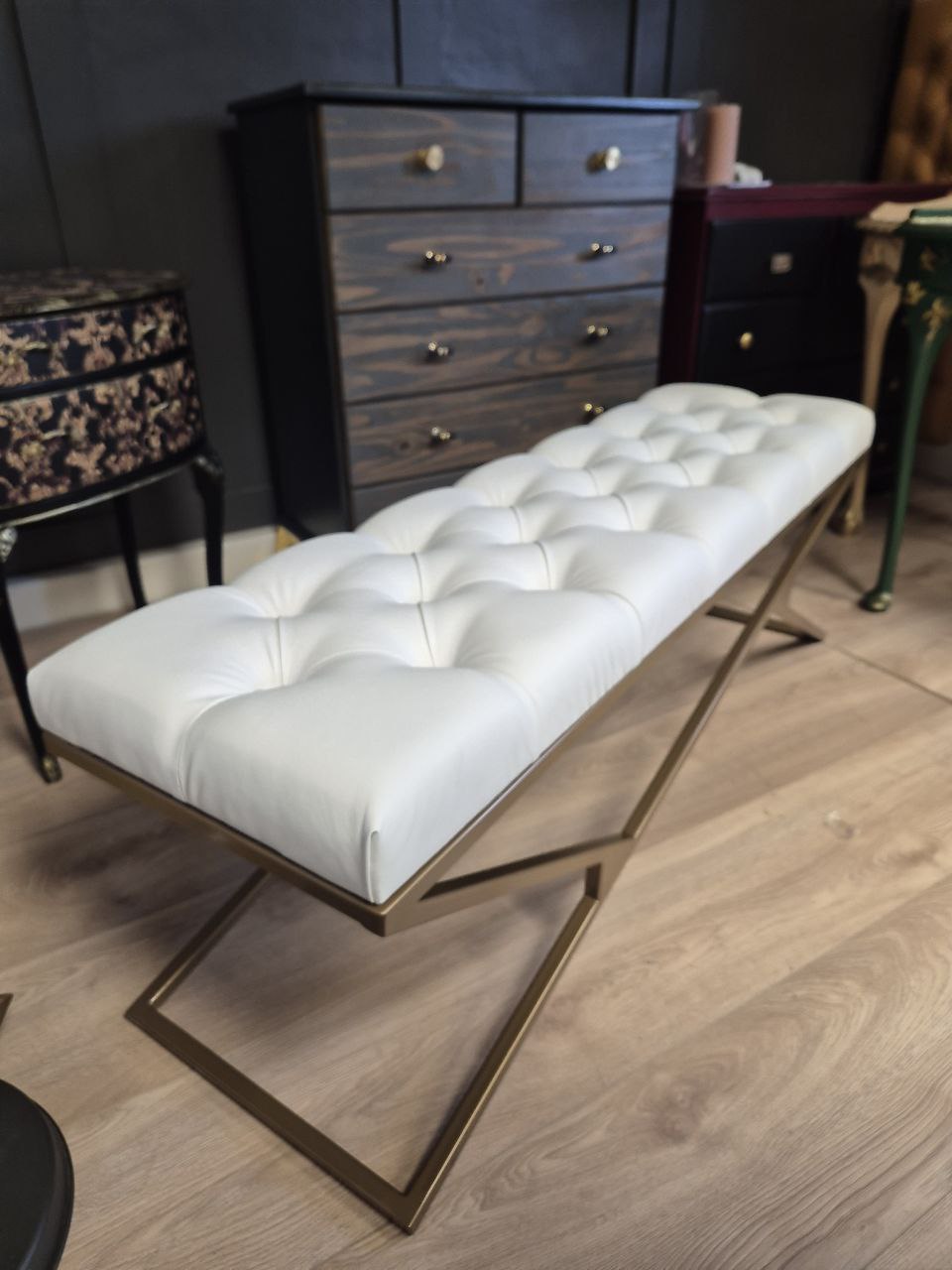 We offer unique benches with a metal frame that are fully handmade. We prioritize high quality, which is why we use premium velvet as upholstery materials. This ensures that our benches are not only stylish but also durable and comfortable.